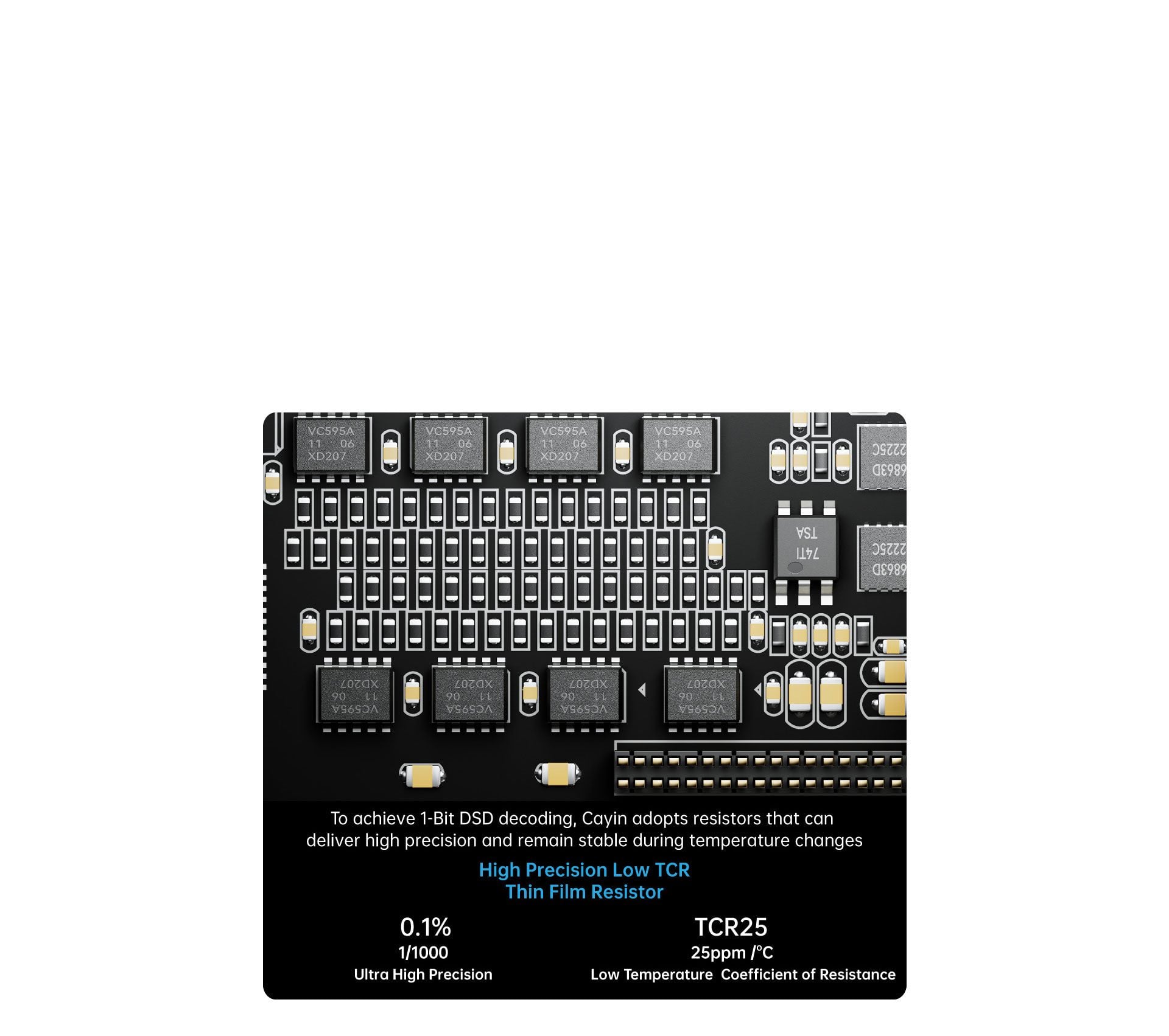 Bộ DAC gồm 128 điện trở màng mỏng (Thin Film Resistors) chính xác cao, tương tự cấu trúc DAC rời trong máy nghe nhạc Cayin N7.