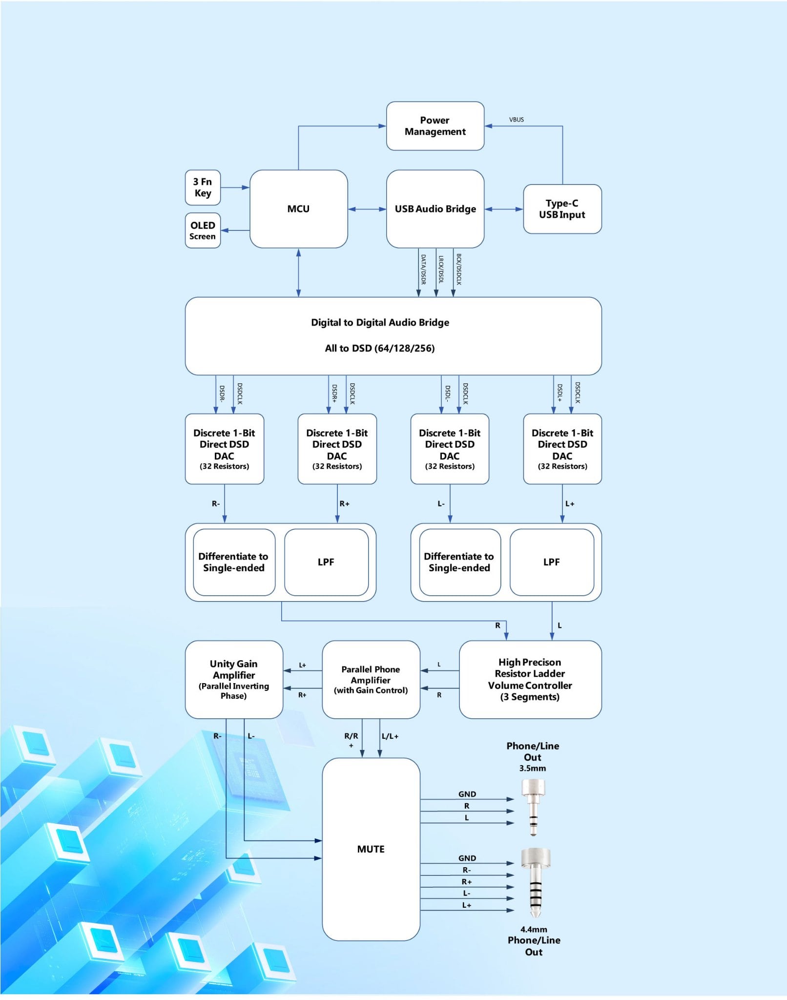 Cấu trúc này giúp bảo toàn độ tinh khiết tín hiệu, ngăn nhiễu từ xung nhịp (clock) và DSP xâm nhập vào tầng khuếch đại.