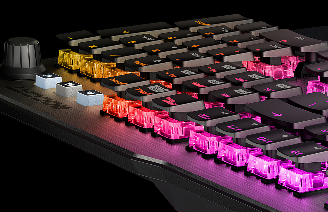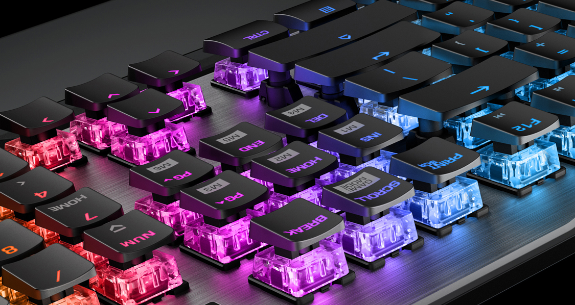 Bàn phím cơ Roccat Vulcan cung cấp nền tảng tốt nhất cho cơ chế đèn nền AIMO. Mỗi switch tích hợp 1 đèn LED độ bền cao với 16 triệu màu với hàng loạt hiệu ứng ánh sáng khác nhau. Switch làm bằng vật liệu trong suốt đồng nghĩa với việc ánh sáng đa màu sắc dễ dàng xuyên qua và trải đều trên mỗi phím bấm.